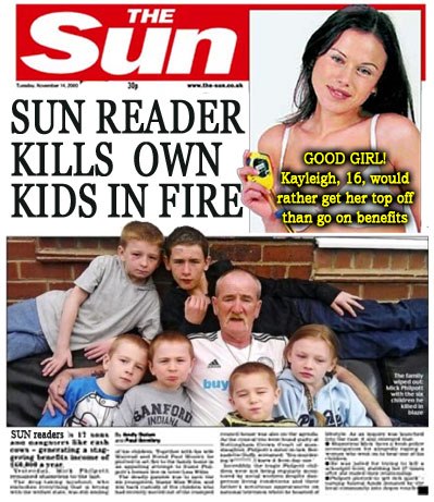 The Scum viciously condemned Labour’s plans to bring in the Minimum Wage and has said it shouldn’t rise. It opposed the Social Chapter and has backed moves to come out of it. This means agency workers, part-time workers, temporary workers will all lose rights, as well many low-paid and minimum wage workers. It condemned the postmen for going on strike in 2009, the train drivers in 1994, attacked the printers at Wapping and printed a false front page about Arthur Scargill in 1984 and backed the pit closures. It backed the poll tax, called protestors scum, and attacked the 50% tax rate on those on £100,000 a year or more, saying it drags us all down to a drab level. How many Scum readers are on that a year? It has backed Royal Mail privatisation, public spending cuts, tax cuts and breaks for the well-off.