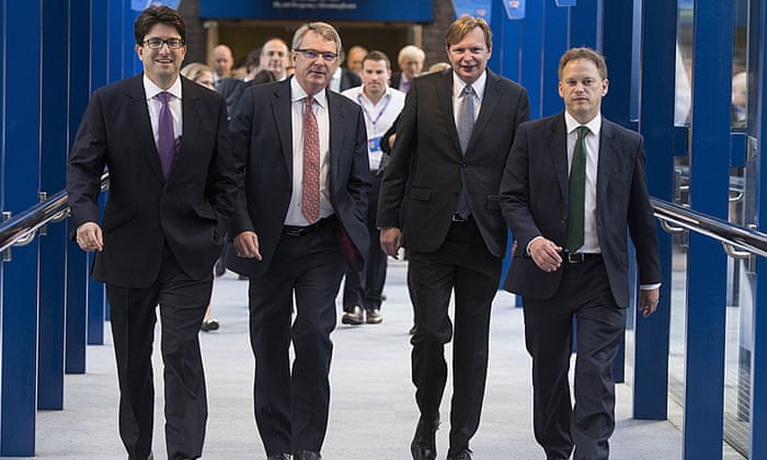Lynton Crosby, second left, at the party’s annual conference in 2015 with, from left, Lord Feldman, Jim Messina (former Obama campaign chief also hired by the Tories) and then party chairman Grant Shapps. Photograph: David Hartley/Rex